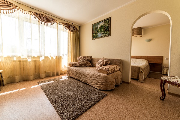 В номере: две комнаты: спальня и гостиная, двуспальная кровать, прикроватные тумбы, шкаф, журнальный столик, раскладной диван, телевизор, холодильник, чайный набор посуды, электрочайник, DVD, сейф