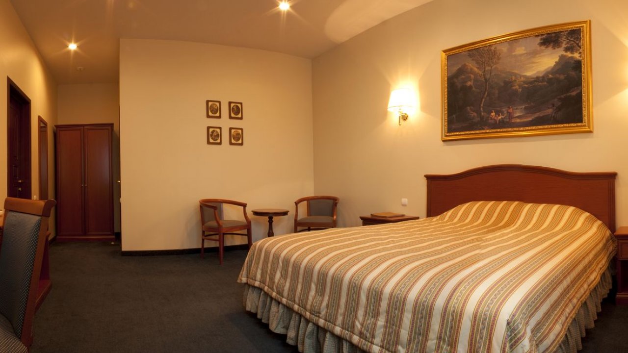 В номере: двуспальная кровать размера 1,8 м на 2 м, телевизор с плоским экраном, телефон, сейф, мини-бар, письменный стол, два стула, настольная лампа, торшер, бесплатный wi-fi, кондиционер